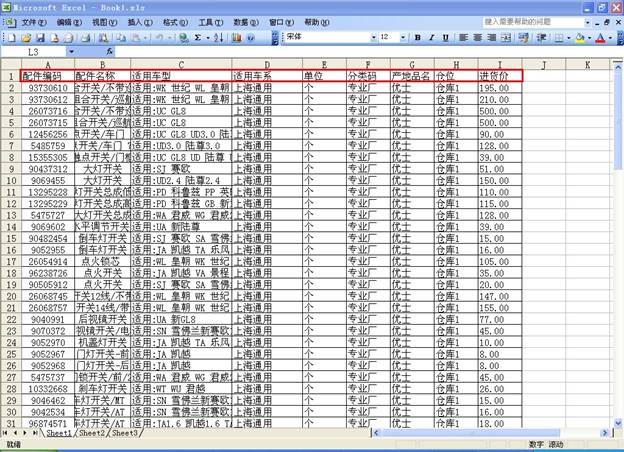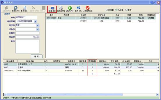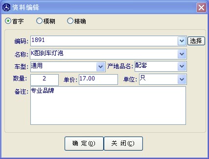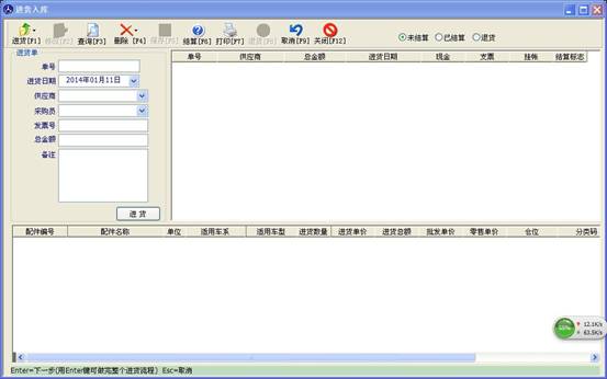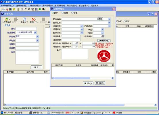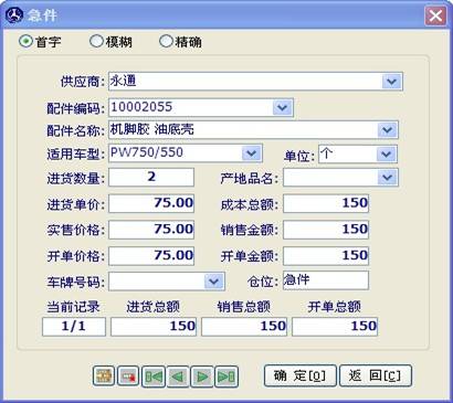 在左側輸入供應商后,點擊“進貨”按鈕,打開配件資料錄入窗口如下圖
