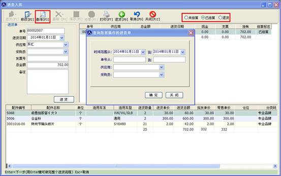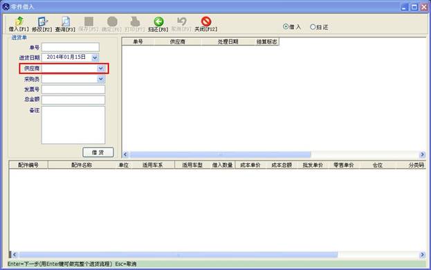 配件借入操作與配件入庫操作近似,在供應商處輸入商家名稱,點“借貨”按鈕