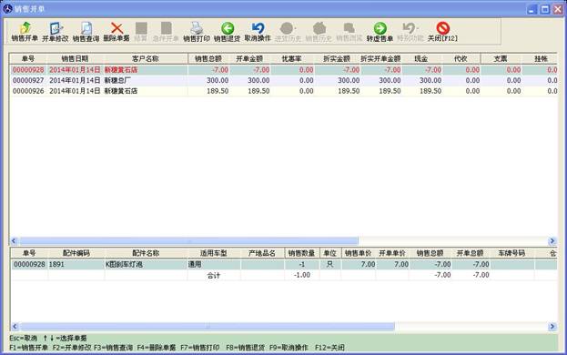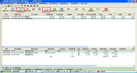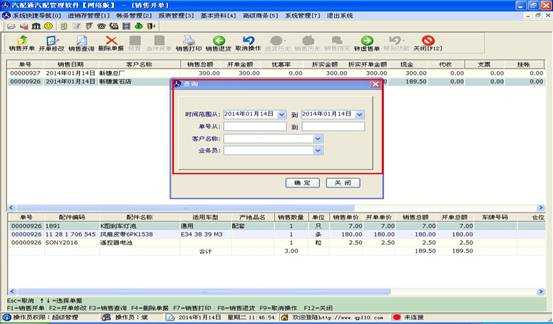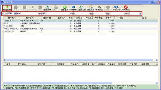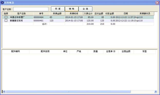 窗口分為上下兩部分,上部分顯示的是開出的單子及客戶一些信息,下部分對應的是此單子里包含的配件信息。