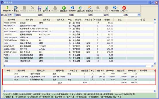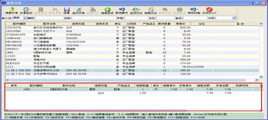 填寫或修正相應信息后,點確定此條配件信息將會出現在銷售開單下方的表格里,如下圖。