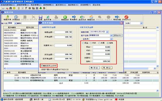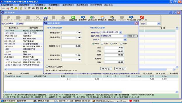 當客戶所要購買的配件都添加到下方的表格后,點擊上方的結算按鈕,進入結算操作