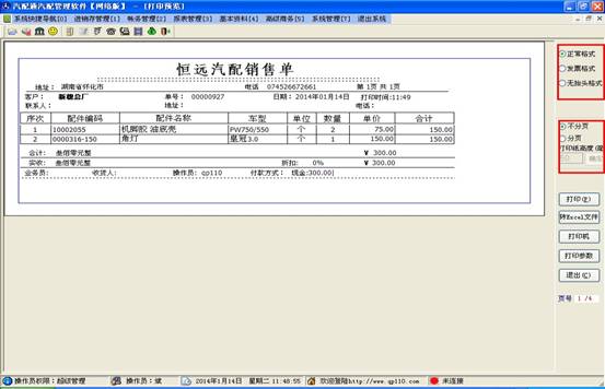 點擊銷售打印按鈕,將彈出銷售打印預覽窗口,如下圖,右邊第一個紅框可選擇打印格式。第二個紅框,當選擇不分頁時軟件會自動調整打印高度,當選擇分頁時軟件會根據下方打印高度框設置的值調整高度。