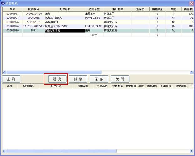 先使用查詢功能找到您要退貨的單子,如果您不記得單號可以根據時間范圍來查詢。查詢出某時間段的銷售后,選擇您要退貨的配件,點擊“退貨”按鈕,如下圖。