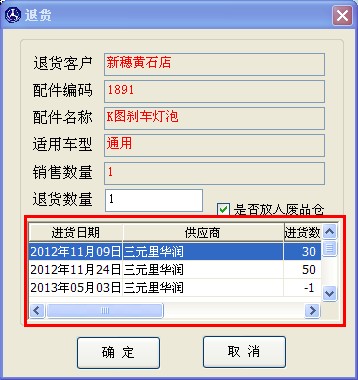 如圖2.3.1,選擇要退貨的配件后,點擊“退貨給供應商”按鈕,進入退貨窗口,如下圖 2.3.2.1 選擇正確的退貨批次,輸入退貨數量后,點結算完成退貨功能。