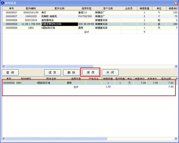 點擊確定后,之前的銷售退貨窗口的下邊表格里就會出現您要退貨的配件,如下圖。如果您還有要退的配件,可以繼續以上的操作,如果沒有,請點擊“保存”按鈕進入結算流程