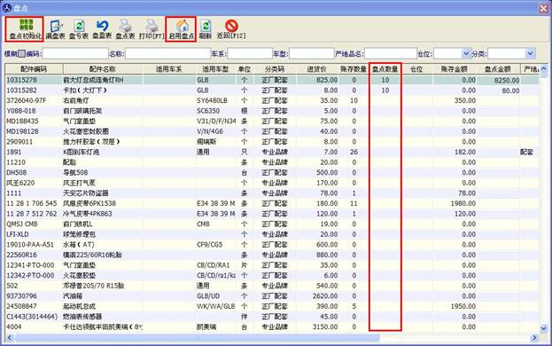 點擊上圖(圖2.3.1)中的“盤點”按鈕,進入盤點窗口,如下圖(2.3.1.1),初次盤點請點擊“盤點初始化”按鈕,點擊后下放的表格將會列出您所有的庫存。如果某個配件庫存數量不正確,您可以在“盤點數量”那列填寫正確的數量,庫存數量正確的配件可不填寫。盤點數量是即時保存的,當您的配件數量過多時,一天沒有盤完,可以第二天再繼續盤,但第二天打開盤點是,請不要點擊“盤點初始化”,要不然前一點盤點的數據就清空了。當盤點完之后,點擊“啟用盤點”按鈕,庫存數量將會變成您盤點后的數量。