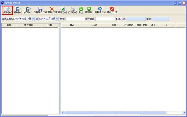 當您的客戶到您這進貨需要一批配件的進貨明細及價格時,您就要使用到報價單。點擊軟件左面版的報價單制作打開預售報價管理窗口,如下圖(2.4.1)。