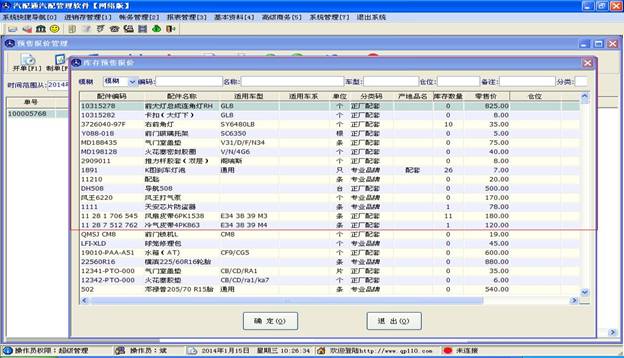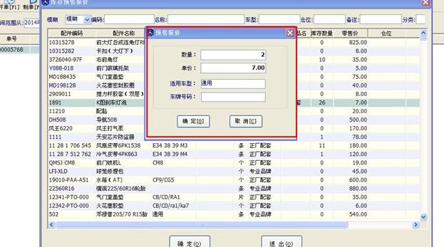 雙擊您需要的配件,在彈出的窗口內輸入數量和單價點確定,這樣就有一個配件進入了您的報價表內,如果還有更多的配件需要報價,您可以在這里繼續選擇。當需要的配件都選擇好后,點擊大窗口的“退出”按鈕