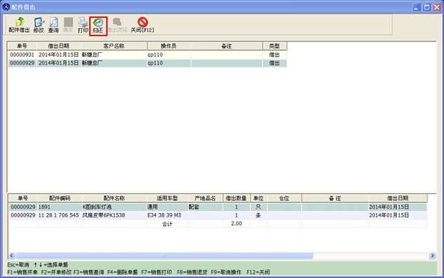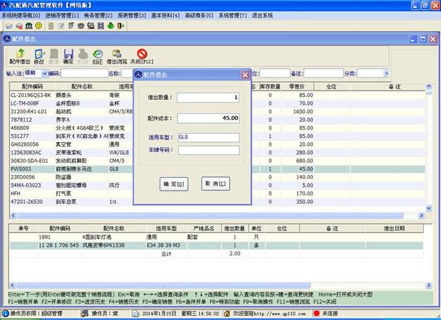 配件借出操作和配件銷售操作差不多,雙擊某條配件,在彈出的框內輸入借出數量等信息,點確定,如果是多個配件借出,可以繼續上面的操作。