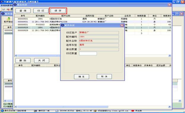 歸還操作和銷售退貨操作差不多,先是使用查詢功能找到您要操作的配件,雙擊后出現歸還窗口,如下圖,輸入數量后點確定,如果有多個配件歸還還可繼續操作,之后點保存按鈕完成借出歸還操作。
