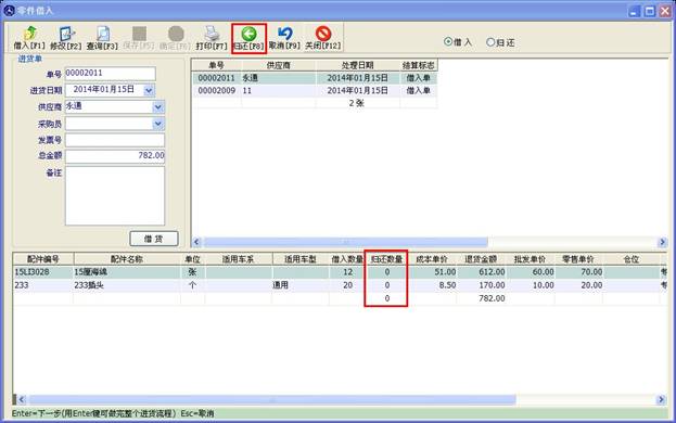 選擇一個單子后,點擊“歸還”按鈕,可對此單子上的配件做歸還操作,其操作過程和退貨給供應商類似,點“歸還”后,下方的表格將多一“歸還數量”這么一列,在此列中輸入數量,再點上面的“保存【F5】”按鈕即可。