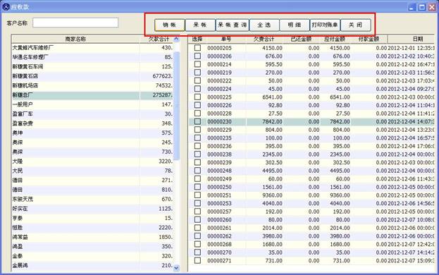 打開應收款窗口,如下圖,左邊是商家名稱及欠款合計,當您點擊左邊的某條信息時,右邊的表格會顯示出其應付或應收的單子列表