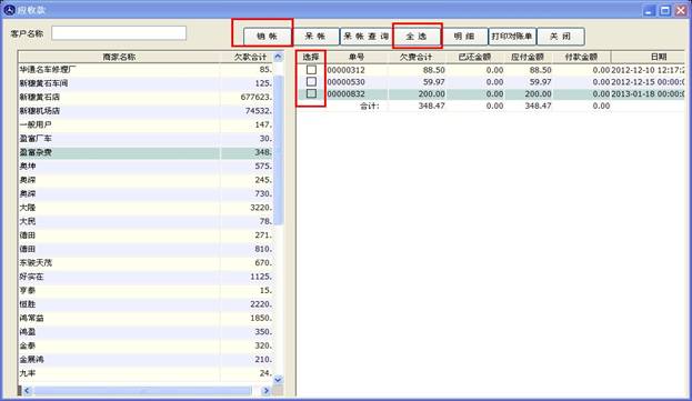 銷帳操作即您已經收到這筆款項或者一部份款項,操作如下,如下圖,如果商家一次性全款付清,您可以點擊全選,然后點銷帳就完成了。