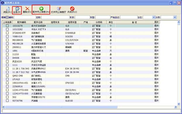 當您打開配件網上銷售窗口時 如下圖,下方的表格會自動幫您讀出您的庫存數據,您可以點“全選”按鈕選擇所有配件,也可以在下面的表格中勾選您要上傳的配件,選定后點擊“配件網上銷售【F4】”按鈕即可。注意點擊配件網銷售按鈕時要求在連接到qp110的狀態下才能進行。