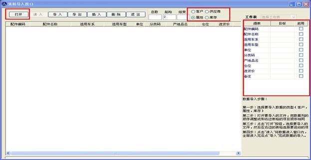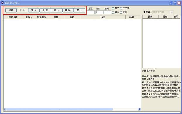 數據導入導出可以將您保存在電腦上的excel 文件 導入到軟件里,此窗口支持導入的有客戶資料導入,供應商導入,屬性導入和庫存導入,如下圖。四個類型的導入操作都一樣,現在我們以屬性導入為例進行講解。
