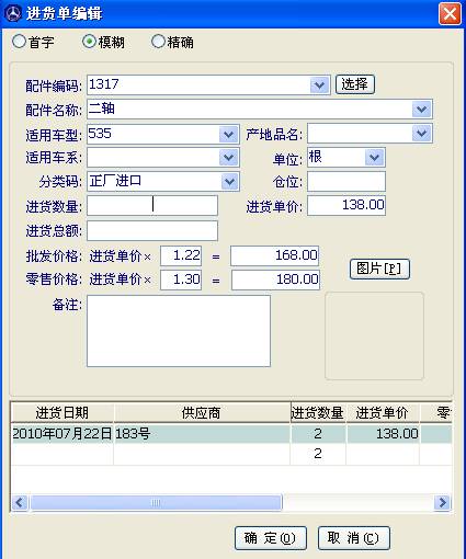 同樣查詢進貨歷史的方法在進貨入庫時查詢,任意輸入好供應商等等,開一張新單,輸入您要查詢的配件名稱或者配件編碼號,