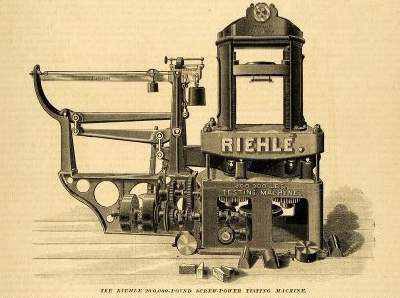 在中國,杠桿式拉伸試驗(yàn)機(jī)被引進(jìn)大概是在上世紀(jì)初,同濟(jì)大學(xué)建設(shè)初期,引進(jìn)一臺同濟(jì)編號為:440001的杠桿式拉伸試驗(yàn)機(jī)(圖二),目前,存放于同濟(jì)大學(xué)力學(xué)試驗(yàn)中心。這臺試驗(yàn)機(jī)上同時標(biāo)有“RIEHLE BRCXPHILA16494”(圖三)的小字,通過檢索,發(fā)現(xiàn)這臺試驗(yàn)機(jī)是由位于美國費(fèi)城的理勒兄弟測試機(jī)械公司(Riehle Brothers Testing machines Company)生產(chǎn)。